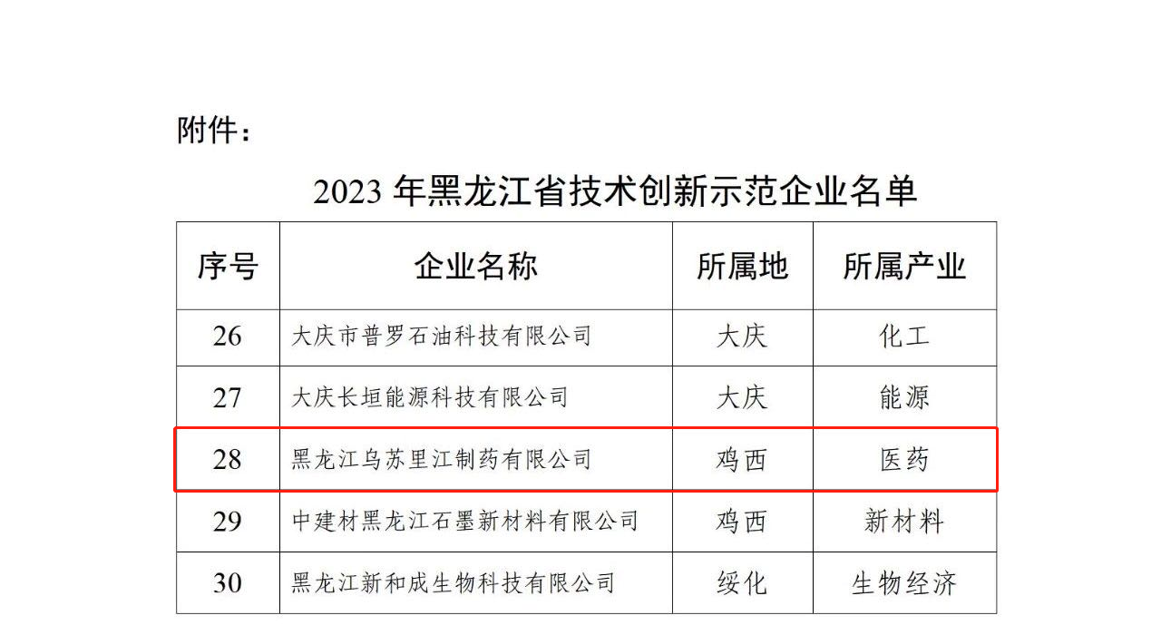 黑龙江乌苏里江制药有限公司此次荣获“2023年黑龙江省技术创新示范企业”,对提高科技创新、完善企业科技创新体系、提升行业引领能力和提高品牌影响力都具有十分深远的意义。